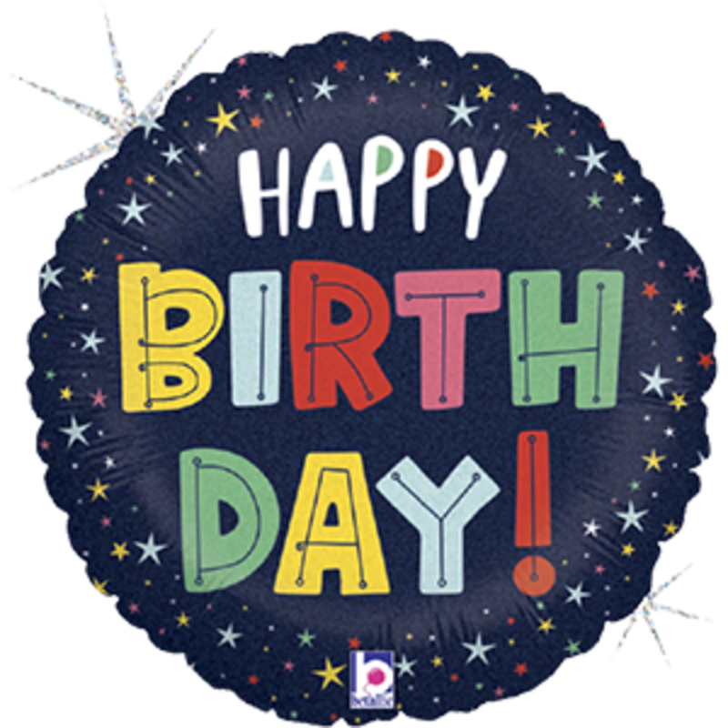 BALÃO METALIZADO REDONDO HAPPY BIRTHDAY COLORFUL STARS HOLOGRÁFICO 18"/45CM - 01 UNIDADE