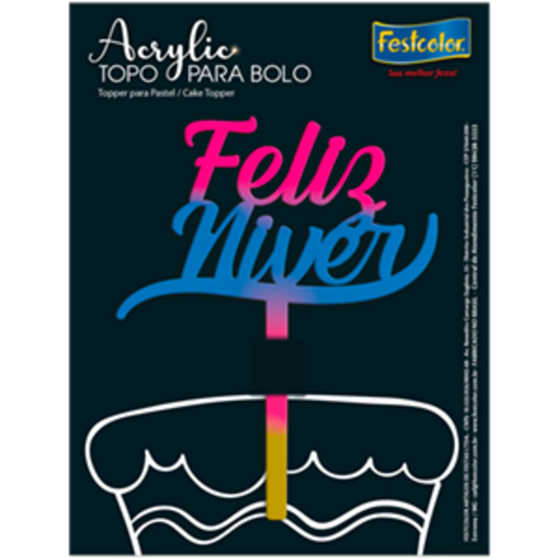 TOPO DE BOLO ACRÍLICO FELIZ NIVER TRICOLOR - 01 UNIDADE